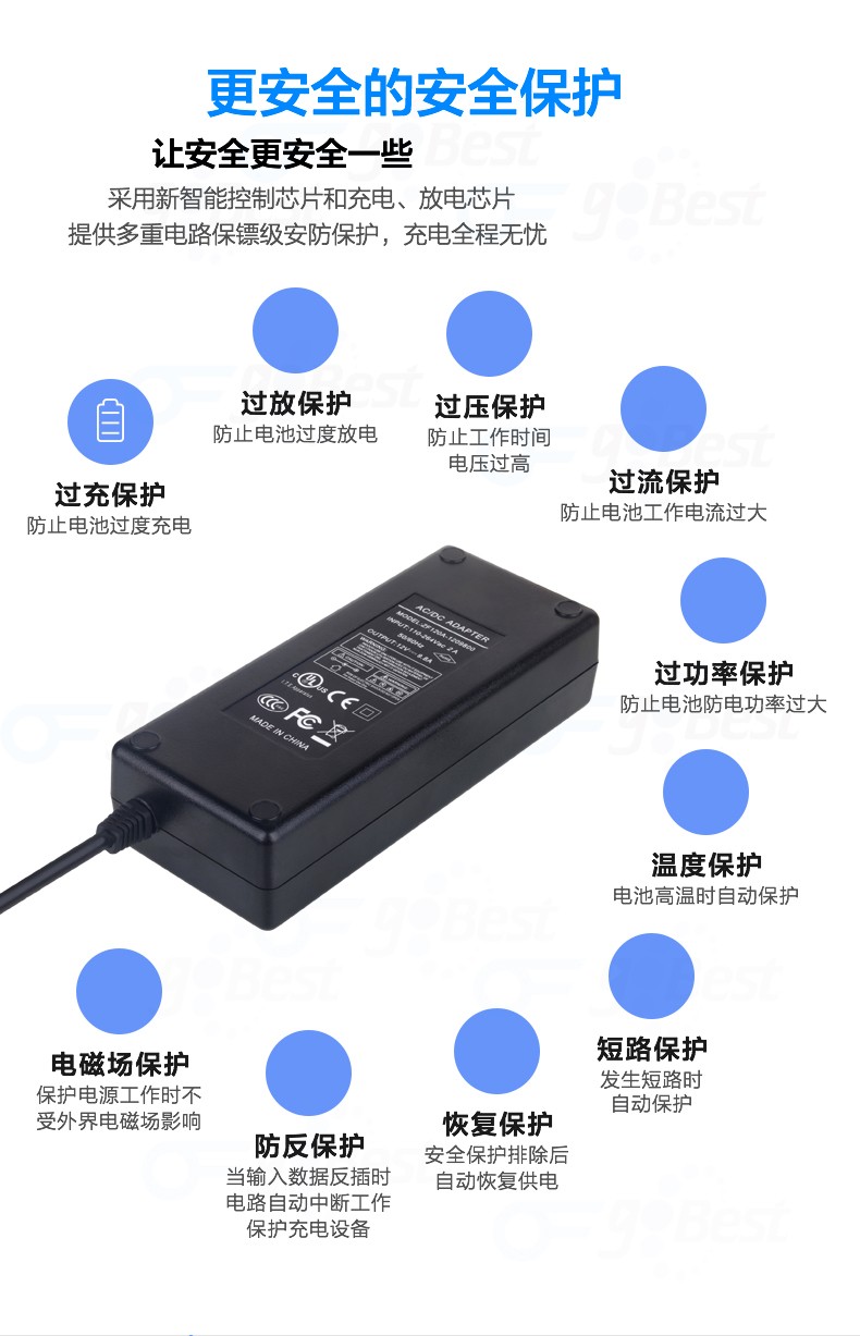 • 采用前沿IC控制方案和先進的制造工藝,高精度,低噪音;過壓,過流,過充,短路等多重保護。