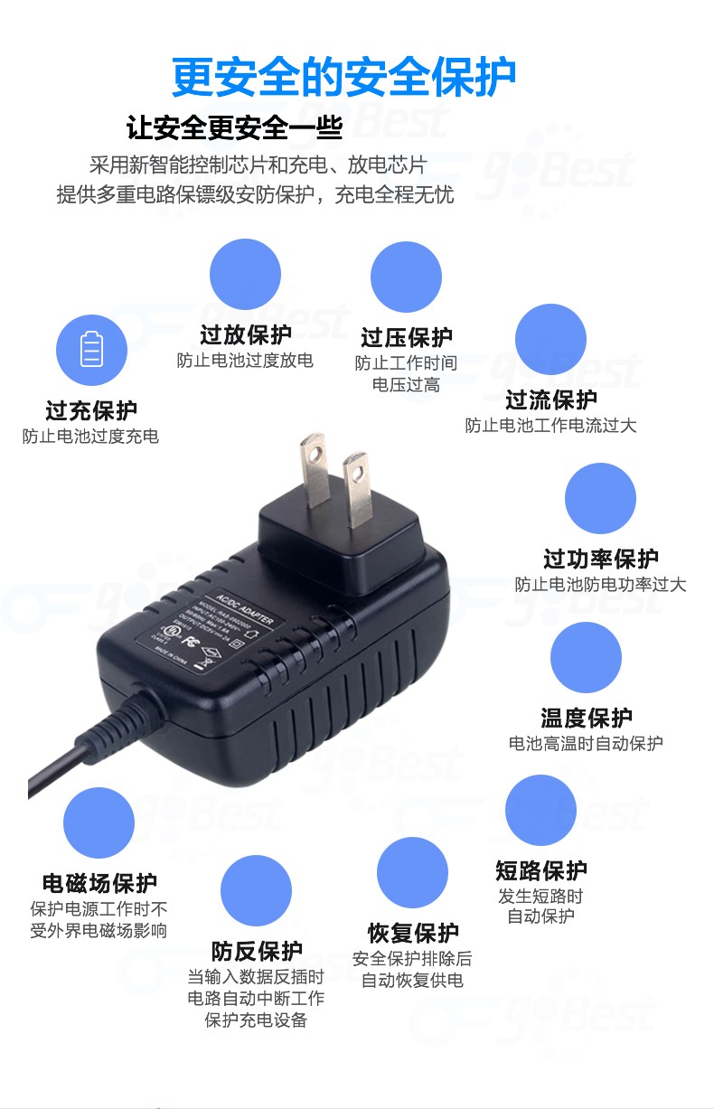 • 采用前沿IC控制方案和先進的制造工藝,高精度,低噪音;過壓,過流,過充,短路等多重保護。