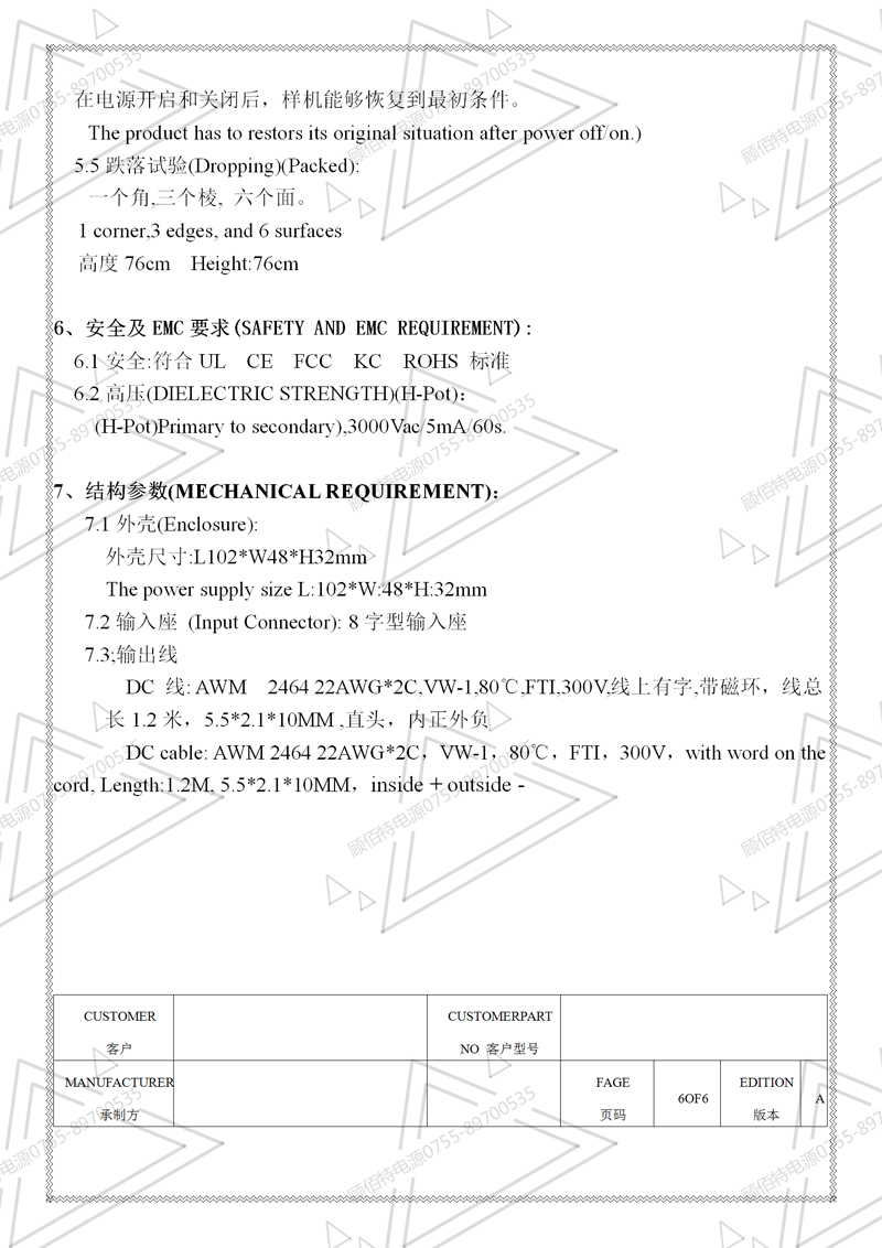 12V1.25A電源適配器規(guī)格書(桌面式)